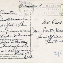 Color image of people on the beach on Marco Island. Woman wearing a yellow swimsuit and sitting in the foreground. Two men standing next to beach chairs in the background. Tradewinds, Admiralty House, and Crescent Beach condos visible. Brown border around the image. Yellow text below the image reads "Marco Island, Florida". Caption on the back reads "Beautiful Marco Island Beach On The Gulf Of Mexico, Showing the luxurious highrise condominiums in the background." Handwritten note on the back reads "Hi Auntie, This place is wonderful. The plane ride was fantastic & I wasn't a bit nervous. Went for a trolley ride today for 1 1/2 hrs. It was really nice. Love R[illegible]". Handwritten address to "Mrs. Betty Knowles" in "Pawtucket, R.I." Postmark reads "Fort Myers, FL 339 PM 1 NOV 1985". |